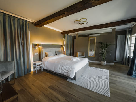 A large lakefront bedroom in warm earth tones embellished by the original wooden beams